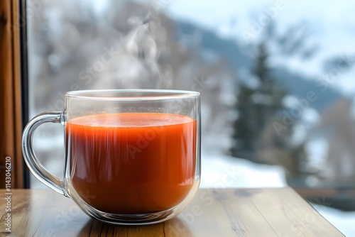 A clear mug of hot tomato soup on a wooden table, near a window with a snowy mountain view. Sunlight adds warmth to the cozy scene