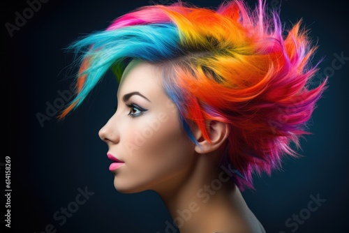 A close - up shot of a young woman with a vibrant and colorful hairstyle, showcasing individuality and creativity. Generative AI