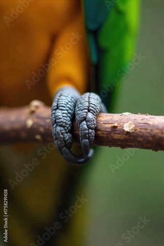 A close up detail of a parrot s foot firmly gripping a textured, natural twig, highlighting the bird s strong talons. Extreme close up macro photograph focusing on a parrot s foot with sharp, strong