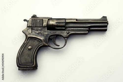 weapon, handgun, firearm, handgun, gun, revolver, metal, steel, antique, vintage, retro, close, up, shot, detail, barrel, trigger, grip, handle, sight, cylinder, hammer, round, chamber, cartridge, defense, protect, security, isolated, flat, lay, object, design, shadow, texture, aged, rustic, bronze, brown, grey, dark, tool, equipment, side, lethal, deadly, dangerous