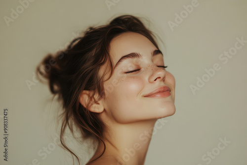 smile, woman, nose, health, cheek, hair, lip, shoulder, eyelash, ear, neck, flash, jaw, lipstick, make-up, gesture, happy, makeover, black, long, step, brown, art, layered, peach, portrait, fashion, fun, illustration, photo, beauty, face, model, skin, clean, make-up, eye, young, person, care, skincare, glamour, fresh, lip, natural, studio, closeup, spa, people