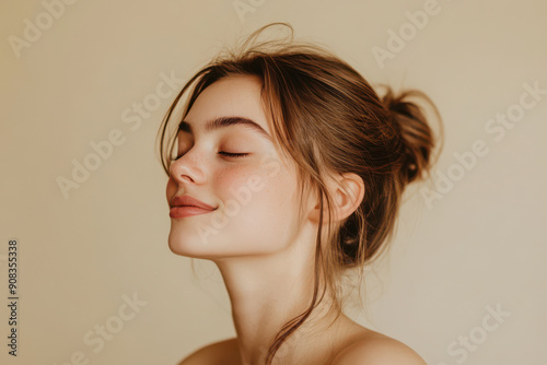 smile, woman, nose, health, cheek, hair, lip, shoulder, eyelash, ear, neck, flash, jaw, lipstick, make-up, gesture, happy, makeover, black, long, step, brown, art, layered, peach, portrait, fashion, fun, illustration, photo, beauty, face, model, skin, clean, make-up, eye, young, person, care, skincare, glamour, fresh, lip, natural, studio, closeup, spa, people
