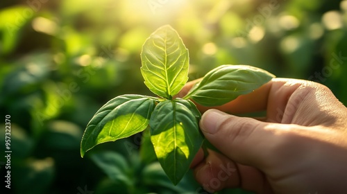 A close up of a hand gently holding a single basil leaf, with sunlight filtering through