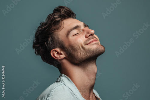 A close up of a man's face with his eyes closed