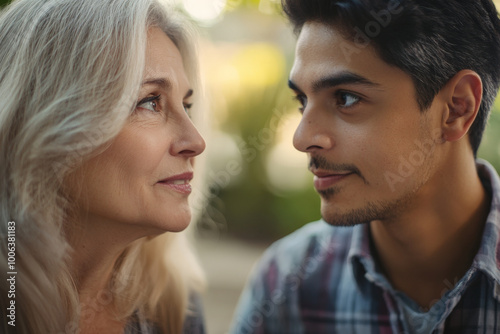 close, up, middle, aged, caucasian, woman, young, hispanic, man, interview, setting, their, engaged, expression, background, softly, blur, sharpened, interaction