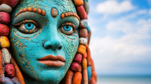 close, up, statue, blue, eye, colourful, hair, woman, 1, person, many-coloured, adult, portrait, beauty, human, face, young, closeup, outdoors, culture, fashion, nature, creativity, colours, indigenous, culture, fun, religion, man, female, lifestyle, paint, sensuality, model, looking, woman, travel, elegance, view, smiling, eye, glamour, summer, background, decoration, copy space, product