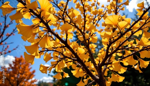 A close up of a tree adorned with vibrant yellow leaves, set against the backdrop of a blue sky