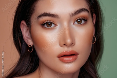 close, up, face, long, brown, hair, closeup, portrait, young, dark, styled, loose, wave, fall, over, shoulder, eye, light, colours, eyebrow, perfectly, groomed, filled, wearing, large, dangling, earring, gold, lip, painted, soft, peach, subtile, smokey, eye, make-up, look, background, pastel, green, mood, peaceful, serene, beautiful, cosmetic, earring, eyebrow, girl, woman