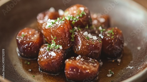 A close up of caramelized fresh dates, styled with sea salt and served on a rustic ceramic plate