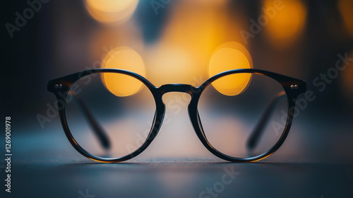 a close up of eyeglasses made of plastic black frame on a ground for showing isolated on a yellow blurred light background