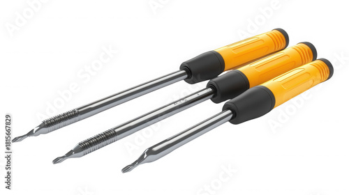 A close up of three screwdrivers with yellow handles on black background on transparent background