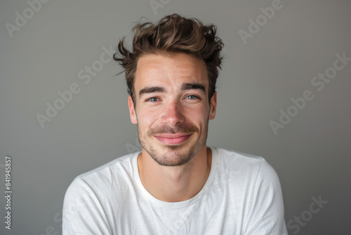 A close up portrait of a young man with a subtle smile