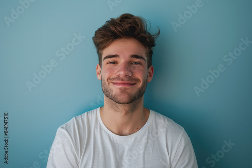 A close up portrait of a young man with a subtle smile