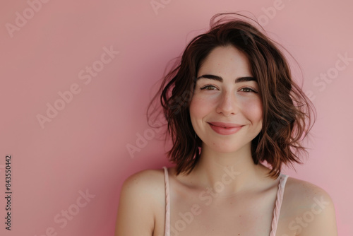 girl, woman, brunette, cheek, lip, smile, beautiful, shoulder, eyelash, ear, happiness, flash, jaw, lipstick, gesture, happy, makeover, black, long, step, hair, art, layered, peach, portrait, fashion, fun, photo, beauty, face, model, skin, clean, make-up, eye, 1, person, care, skincare, glamour, fresh, lip, natural, studio, make-up, closeup, people, health