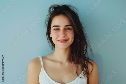 girl, woman, brunette, cheek, lip, smile, beautiful, shoulder, eyelash, ear, happiness, flash, jaw, lipstick, gesture, happy, makeover, black, long, step, hair, art, layered, peach, portrait, fashion, fun, photo, beauty, face, model, skin, clean, make-up, eye, 1, person, care, skincare, glamour, fresh, lip, natural, studio, make-up, closeup, people, health