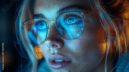 A close up portrait of a young woman with blue eyes, wearing glasses, and blonde hair. Her eyes are looking off to the side, and the reflection of blue light can be seen in her glasses.