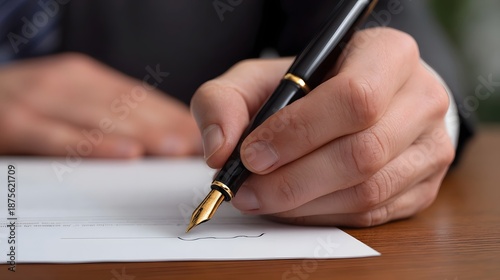 professional, hand, signing, document, luxurious, black, gold, fountain, pen, polished, wooden, desk, writing, paper, contract, business, office, wood, table, signature, ink, white, brown, formal, agreements, legal, action, commitment, decision, work, job, career, success, plan, strategy, project, approval, authorisation, meeting, communication, close, deal, transaction, investment, finance, datum, record