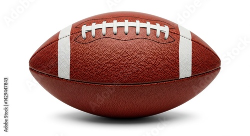 A close up shot of a brown leather american football with white stripes and laces on a white background