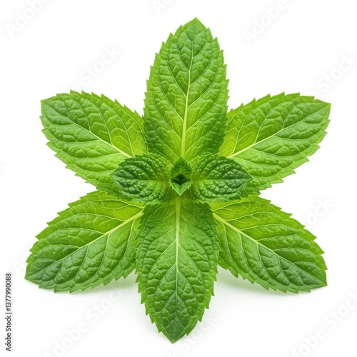 A close up shot of a fresh mint plant with green leaves arranged in a circular pattern on white