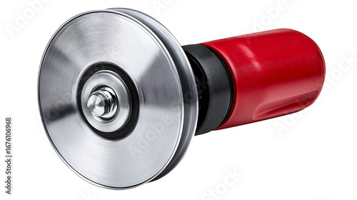 pulley, metal, shiny, red, handle, white background, closeup, mechanical, tool, equipment, machine, hardware, engineering, industry, mechanism, component, device, silver, metallic, round, cylinder, bolt, fastener, black, isolated, precision, industrial, technology, object, closeup, detail, part, steel, connection