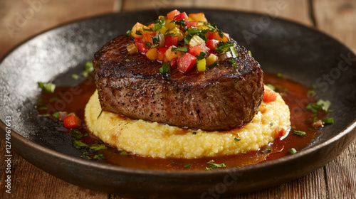 A close up shot of the perfectly seared medium-rare filet mignon, centered on creamy polenta with colorful, vibrant vegetables on an elegant plate, generative AI