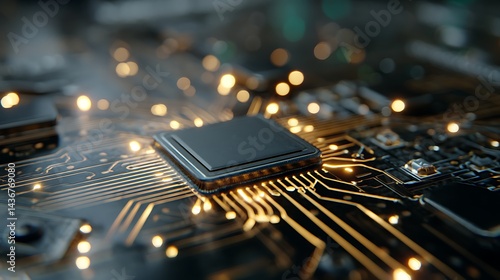 A close up view of microchip on circuit board, showcasing intricate details and glowing connections