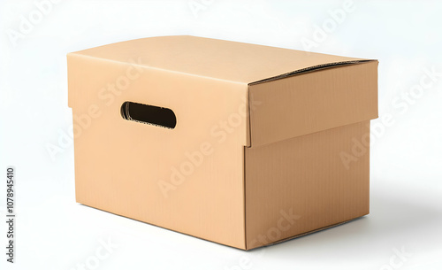 A closed cardboard box with a handle on a white background.
