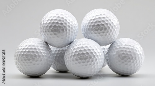 A close-up arrangement of golf balls on a white background, showcasing minimalist sports aesthetics.