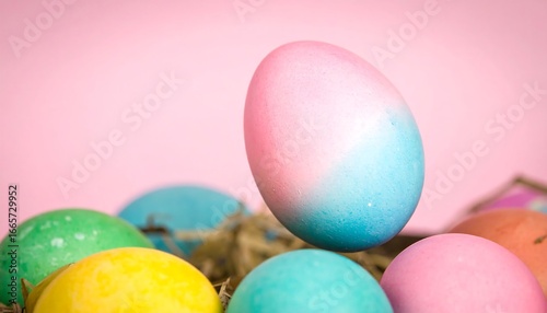 A close-up, brightly colored Easter eggs nestled in straw with a soft pink background, perfect for spring celebrations