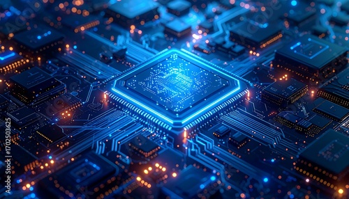 A close-up, futuristic view of a circuit board with a glowing central processor, emitting blue and orange lights