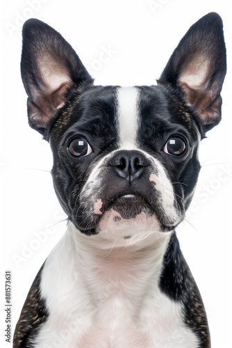 A close-up headshot of a Boston Terrier on a white background, showcasing its expressive eyes, dog, fluffy fur, friendly, cute, mans best friend
