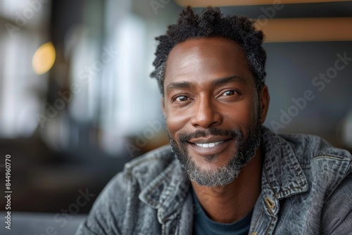 smiling, portrait, cheerful, denim, happiness, adult, male, confident, casual attire, stylish, mature, positivity, content, african american, facial hair, authenticity, expression, joy, individuality, approachable, mature adult, modern, casual clothes, friendly, urban, trendy, comfortable, relaxed, optimistic, contentment, lifestyle, sociability, blurred background, indoor, head shot, eye contact, charisma, engaging