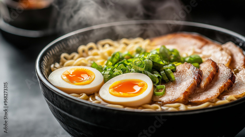 a close-up image of a bowl of steaming ramen noodles, placed on a dark slate table background