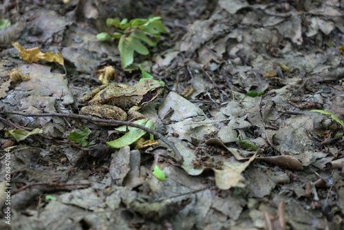 A close-up image of a frog sitting on the forest floor, among fallen leaves, perfectly camouflaged to blend in with its surroundings. This photograph demonstrates the amazing ability of animals to mim