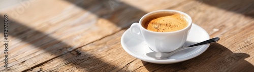 A close-up image of a hot espresso coffee in a white cup with a spoon on a rustic wooden table, illuminated by sunlight.