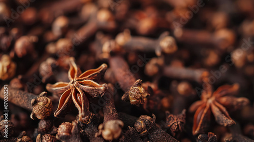 A close-up image of a pile of brown cloves and star anise, showcasing their detailed texture and color