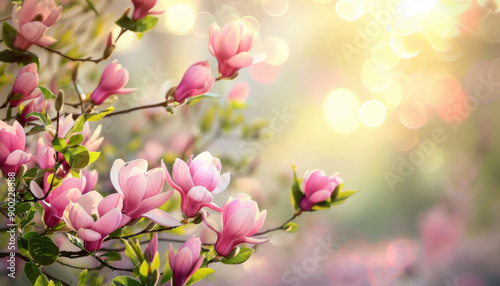 magnolia, blossom, flower, pink, bloom, flower petals, tree, tree branch, leaf, green, spring, nature, sunlight, soft, gentle, delicate, light, bokeh, blur, background, garden, floral, beauty, vibrant, bright, botanical, flowery, natural, fresh, wallpaper, postcard, illustration, design, art, beautiful, romantic, pastel, abstract, serenity, peaceful, elegant, feminine, whimsical, graceful, airy