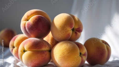 A close-up image presents five ripe peaches tastefully arranged on a white background.