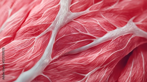 A close-up image showcasing intricate details of muscle tissue, highlighting the fine textures and structures in vibrant red and white colors.