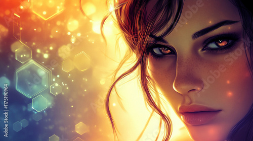 A close-up of a beautiful girl with an intense gaze, against a backdrop of glowing hexagons in soft gradients.