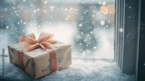 A close-up of a beautifully wrapped Christmas gift tied with a satin ribbon placed on a snow-dusted windowsill.