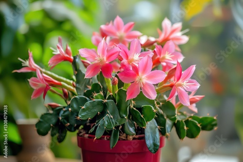 A close-up of a blooming Schlumbergera plant in a flowerpot, with vivid pink or red flowers standing out against the surrounding greenery.