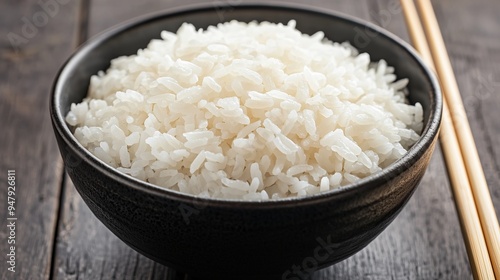 A close-up of a bowl filled with fluffy white rice, perfect for showcasing in culinary, food preparation, or dining themes.