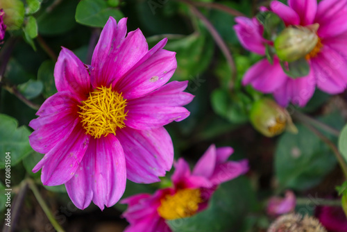 A close-up of a bright pink dahlia draws the eye with its saturated petals and contrasting yellow center, surrounded by other flowers and buds.