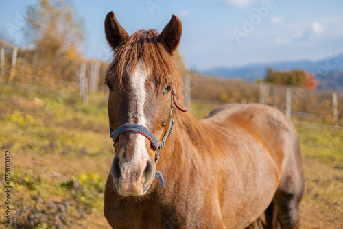 clear sky, animal, animal portrait, autumn, beauty, brown horse, closeup, countryside, equestrian, equine, fall, farm, farmland, field, foliage, grazing, halter, horizon, horse, landscape, mammal, mountain, natural light, nature, pasture, peaceful, pet, portrait, rural, rustic, scenic, seasonal, serene, sky, tranquil, tree, wilderness, wildlife