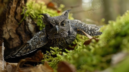 owl, nature, wildlife, camouflage, forest, moss, leaf, bird, animal, habitat, environment, feather, branch, natural, predator, eye, wing, perched, serene, quiet, detail, closeup, stillness, ecosystem, beauty, calmness, green, brown, earth, rustic, pattern, texture, observation, species, avian, flight, nocturnal, behaviour, flora, fauna, landscape, scenery, biodiversity, exploration