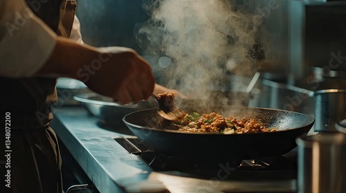 A close-up of a chef preparing a gourmet dish in a professional kitchen.