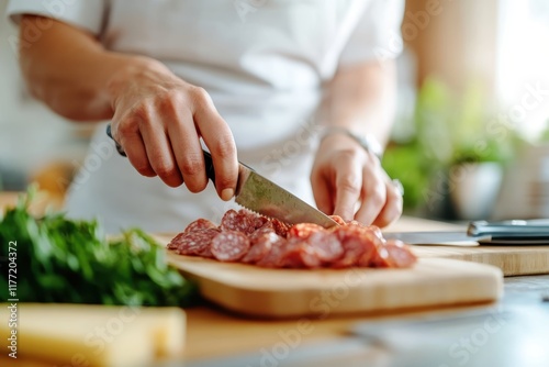 A close-up of a chef skillfully slicing salami, emphasizing the craftsmanship behind creating a delectable charcuterie board featuring assorted cold cuts.