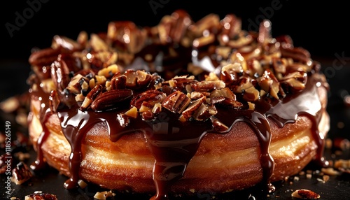 donut, chocolate, glaze, nut, pecan, dessert, sweet, food, pastry, bakery, delicious, deliciously, treat, snack, sugar, tasty, unhealthy, homemade, baking, receipe, sweetness, carb, calorie, fresh, baked, sprinkle, brown, closeup, macro, background, black, dark, appetising, craving, epicure, energy, breakfast, brunch