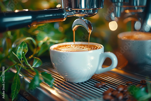 A close-up of a coffee machine brewing coffee into a white cup, set in an office environment, with a blurred background highlighting the workspace atmosphere and modern convenience